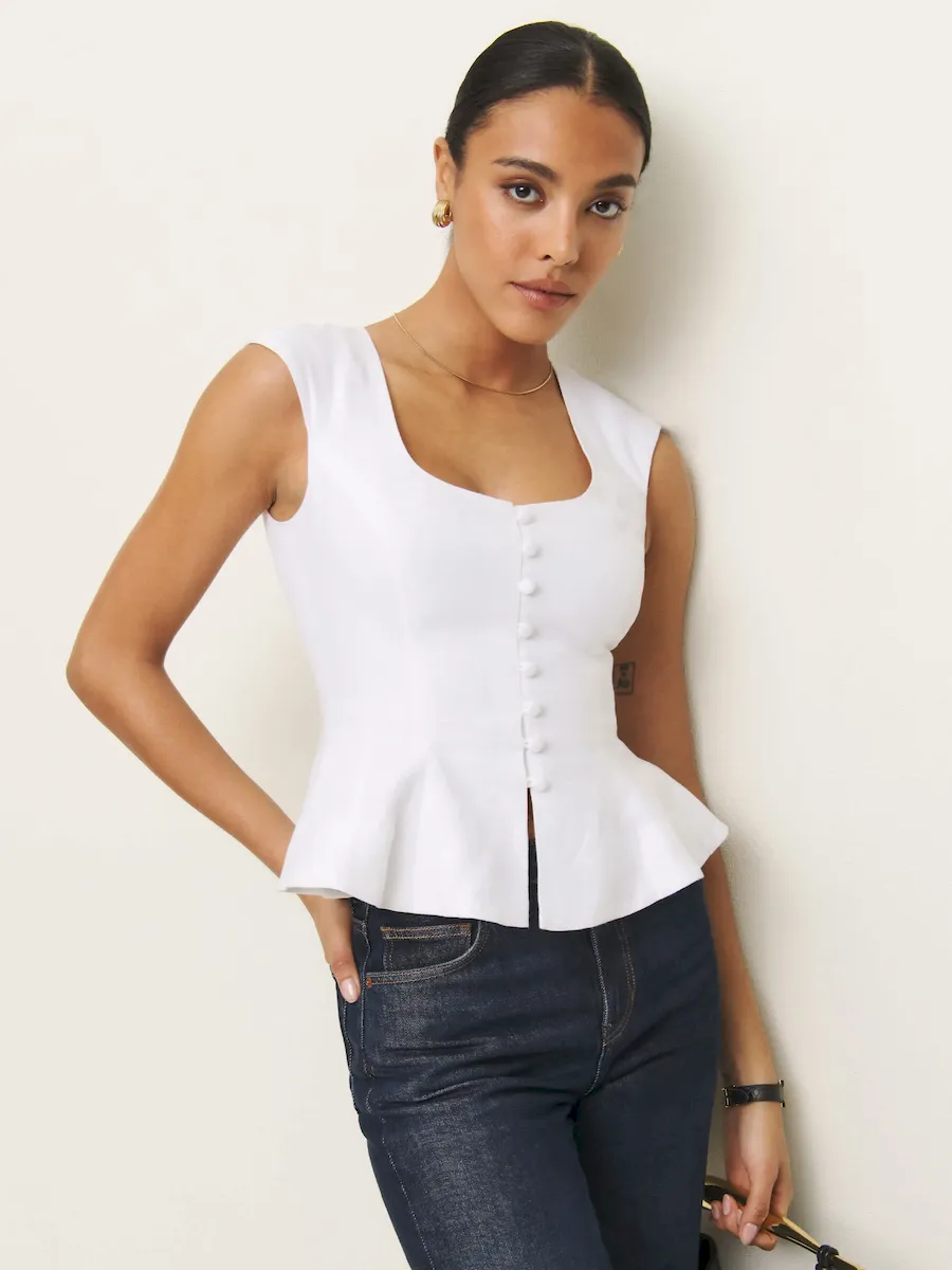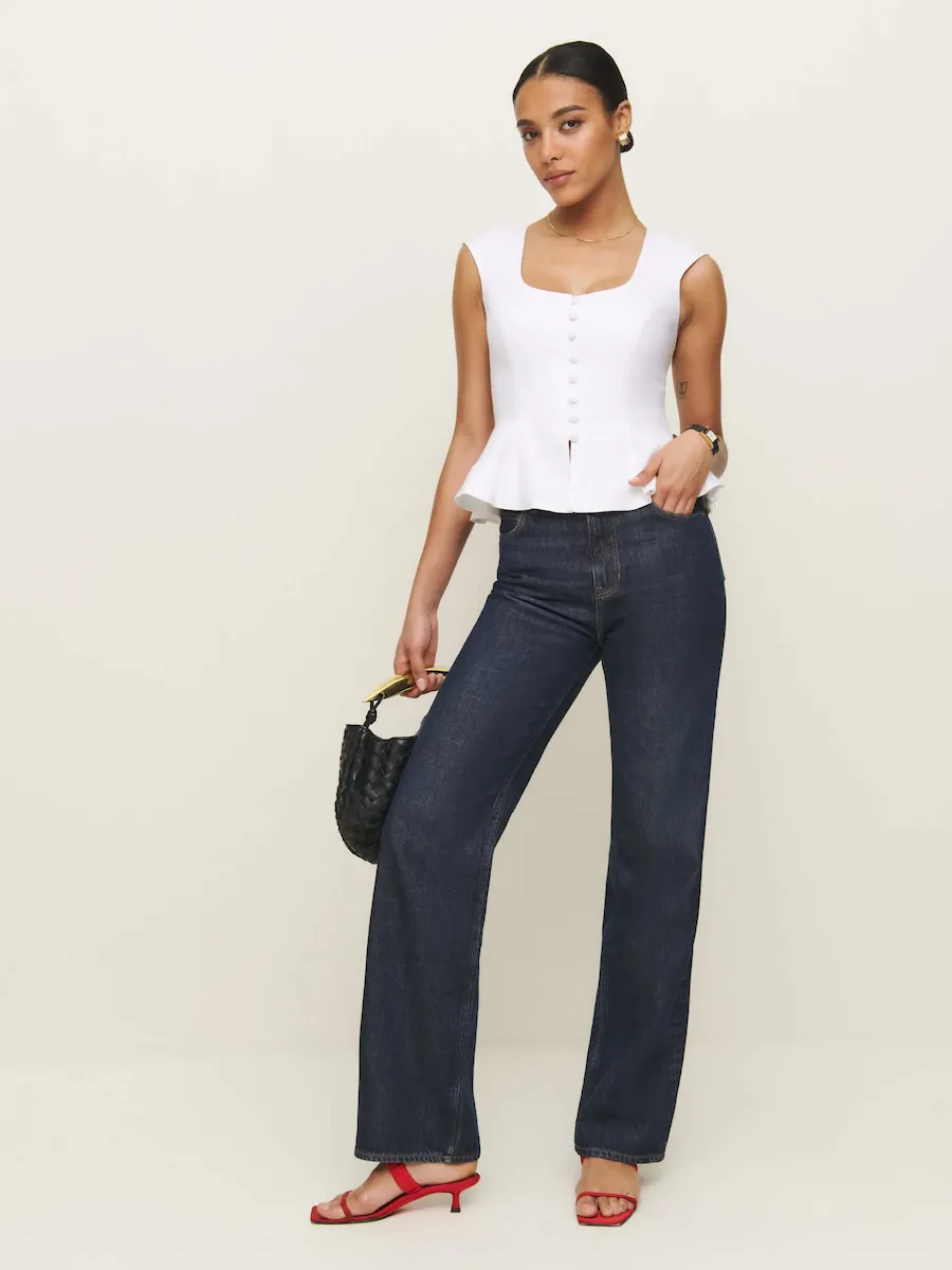 The model is wearing a size 4 and is 5’11”, 26″ waist, 38″ hips, 35″ bust.