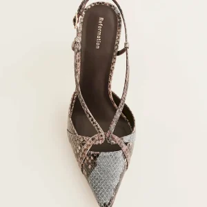 Snake embossed bovine leather with a multi brown tonality. Spot clean. More onfabric & care.