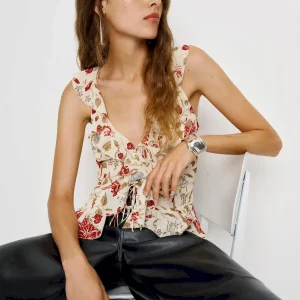 The model is wearing a size 0 and is 5’9″, 24″ waist, 34″ hips, 30″ bust.