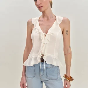 The model is wearing a size 0 and is 5’10”, 25″ waist, 34.5″ hips, 31″ bust.