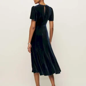 This is a soft, non-stretch velvet with a medium pile – 82% rayon, 18% silk. Dry clean only. More onfabric & care.
