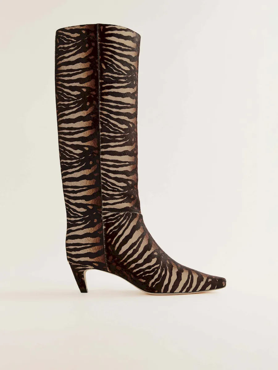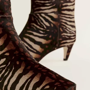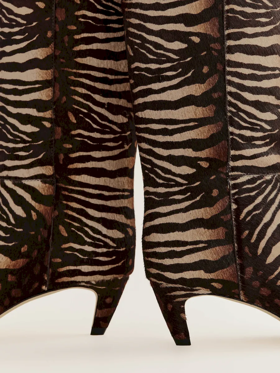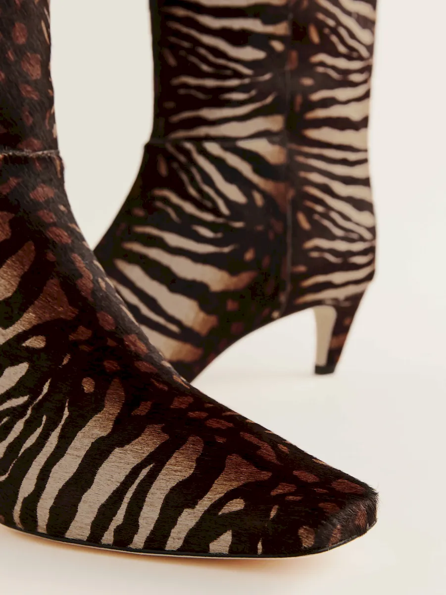 Silky hair calf with distorted animal print pattern. Spot clean. More onfabric & care.