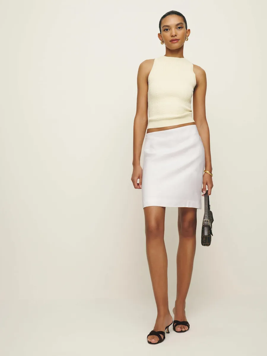 The model is wearing a size 0 and has a 24″ waist, 34″ hips.