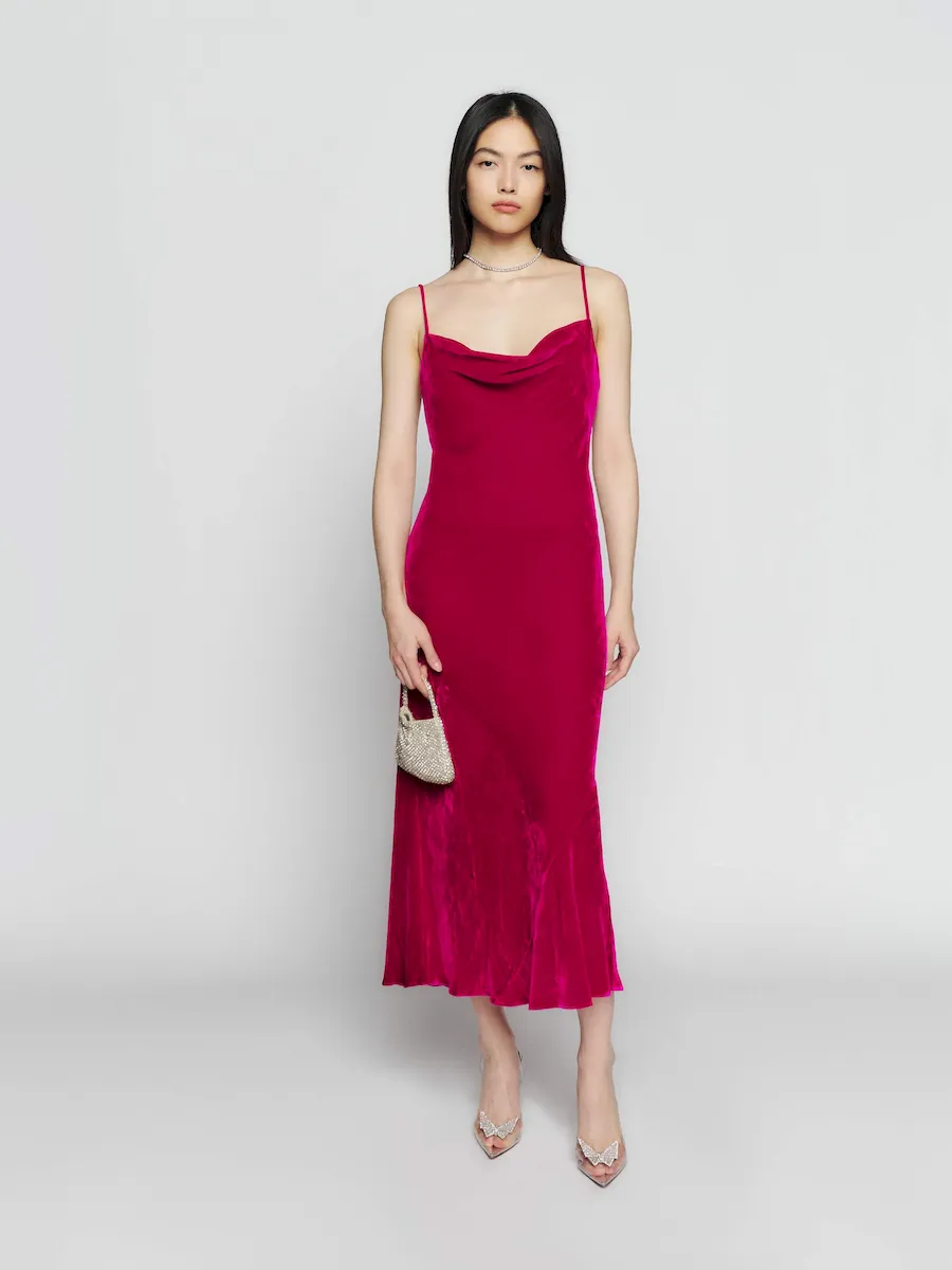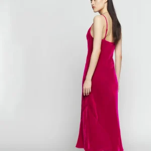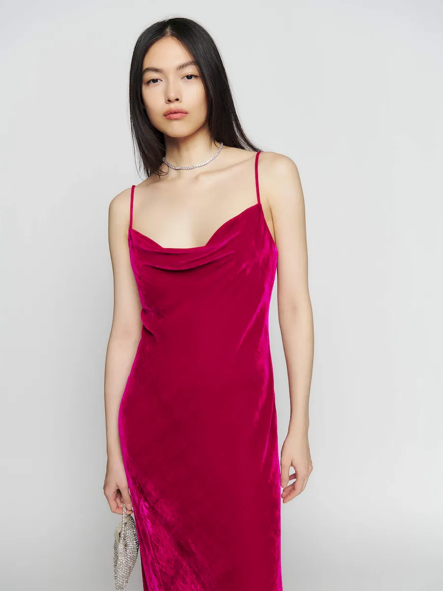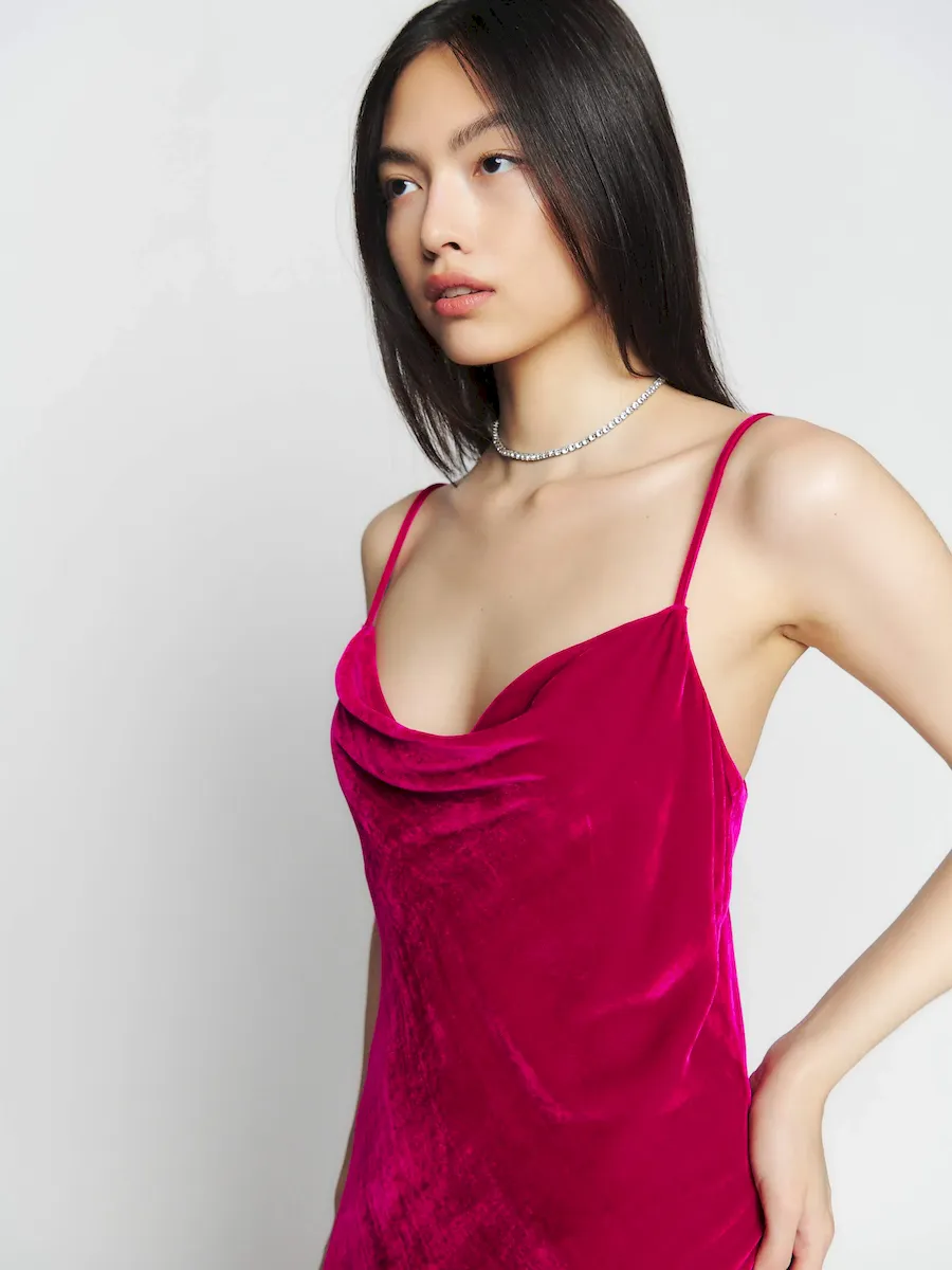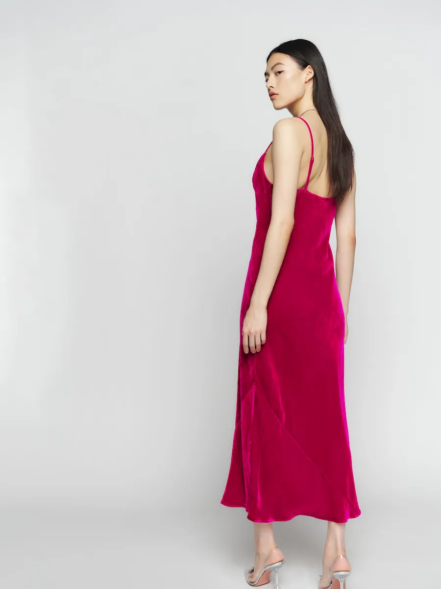 This is a soft, non-stretch velvet with a medium pile – 82% rayon, 18% silk Dry clean only. More onfabric & care.