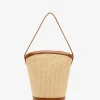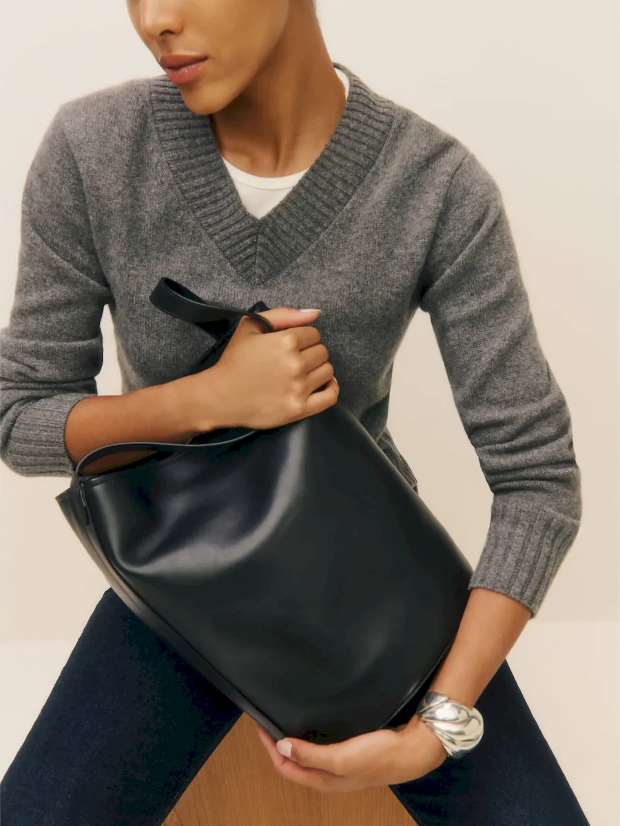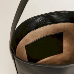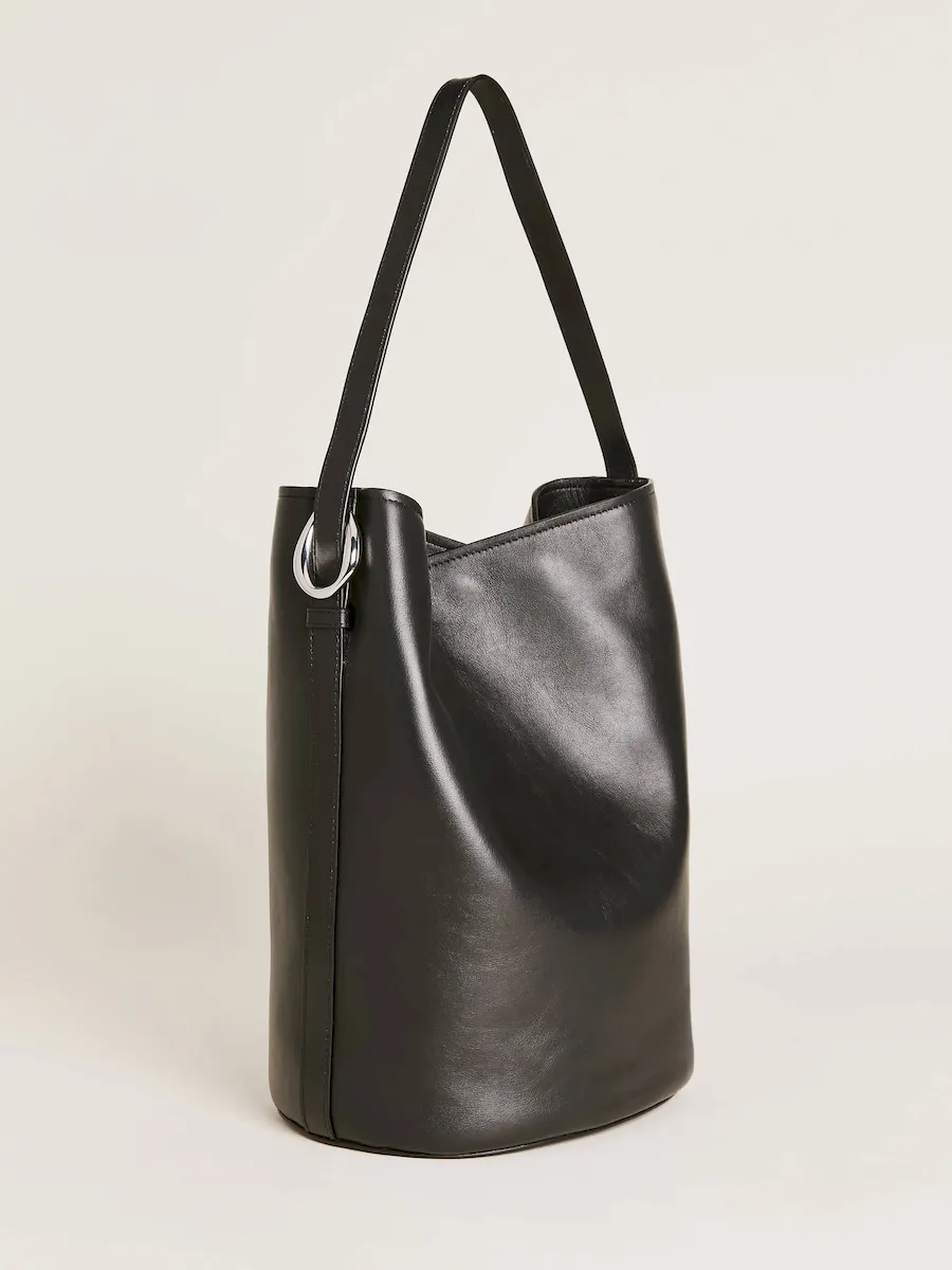 a slouchy bucket bag with a magnetic closureand inside card pocket.