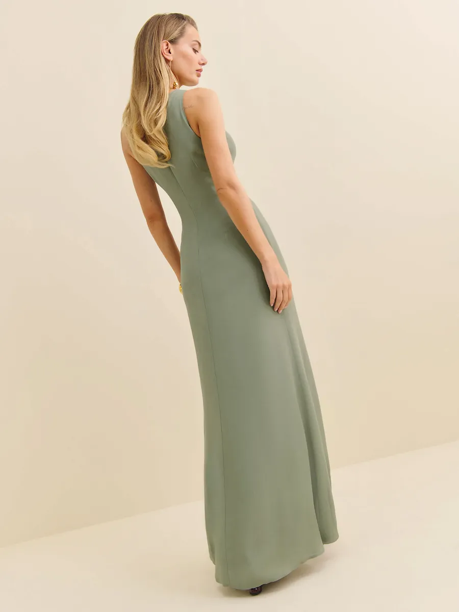 non-adjustable straps, cowl neckline, side slit.