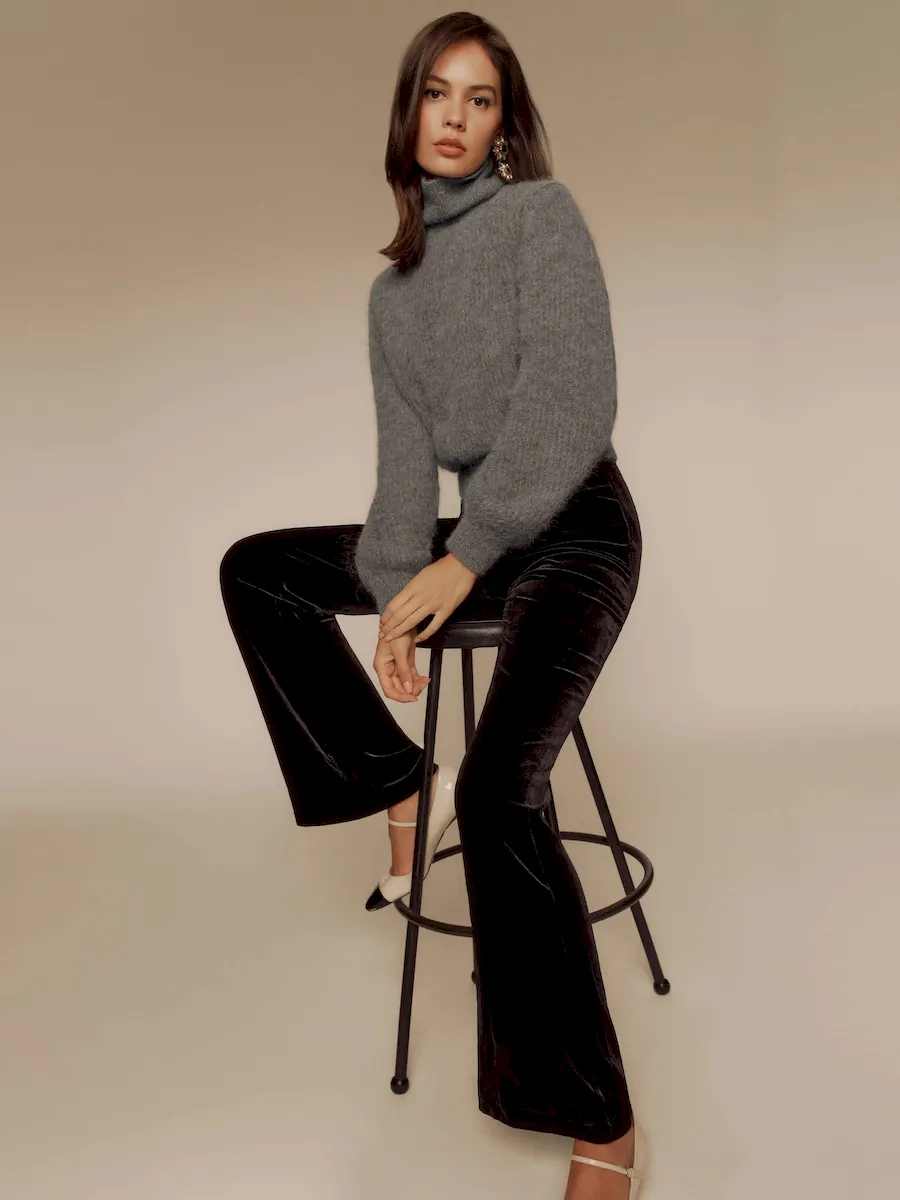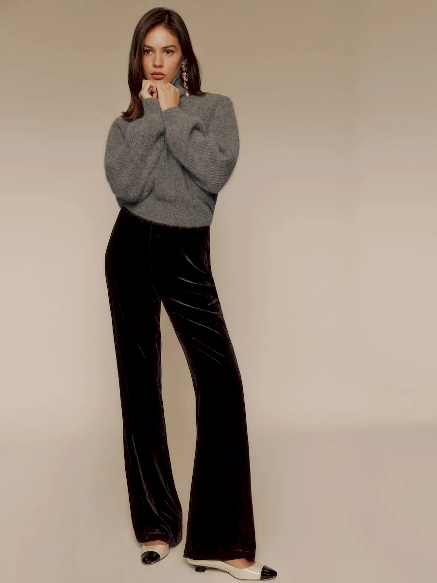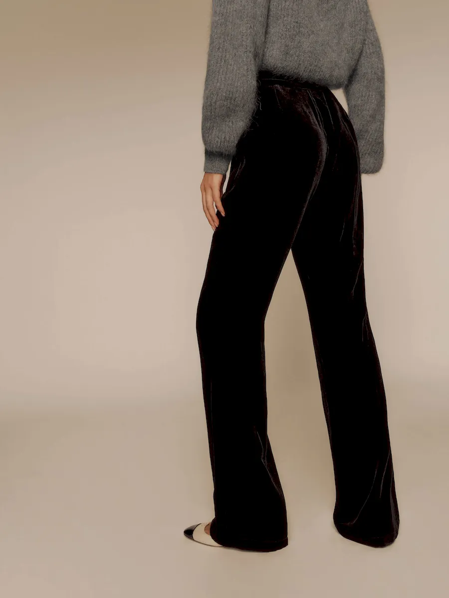 This is a soft, non-stretch velvet with a medium pile – 82% rayon, 18% silk. Dry clean only. More onfabric & care.