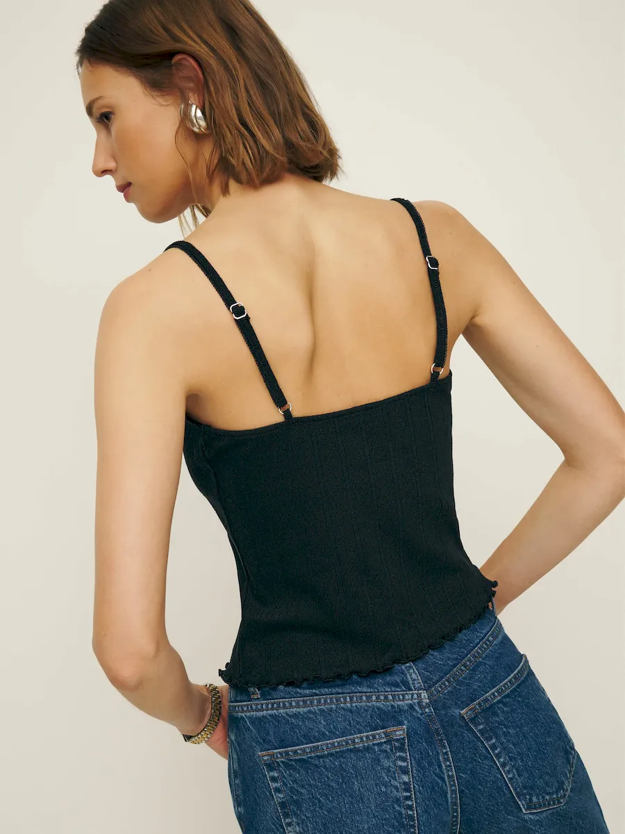 The model is wearing a size XS and is 5’11”, 24″ waist, 35″ hips, 31″ bust.