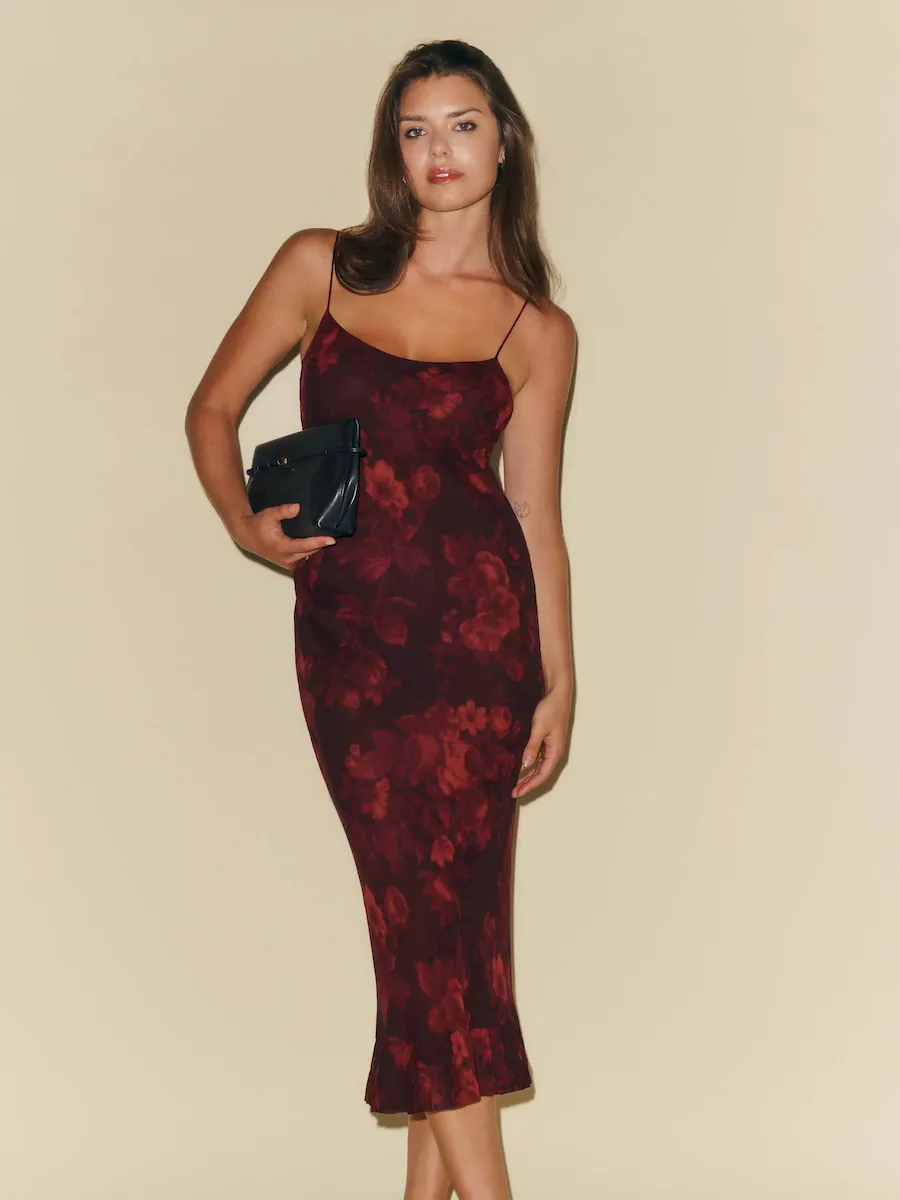 The model is wearing a size 6 and is 5’9″, 27″ waist, 38″ hips, 32″ bust.