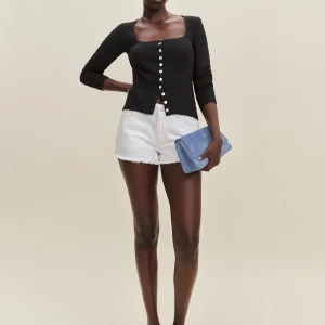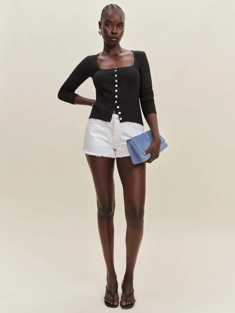The model is wearing a size 25 and has a 25″ waist, 35″ hips.