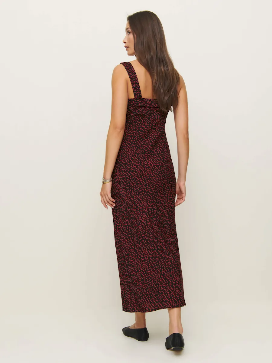 The model is wearing a size 0 and is 5’9″, 24″ waist, 34″ hips, 31″ bust.