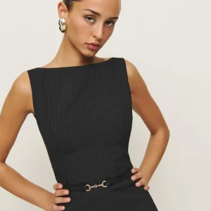 The model is wearing a size 0 and is 5’8″, 23″ waist, 35.5″ hips, 30″ bust.