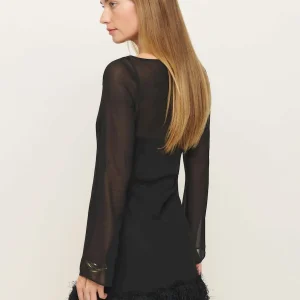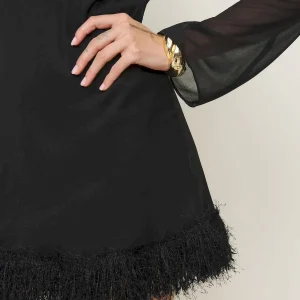 The model is wearing a size 0 and is 5’10”, 25″ waist, 34.5″ hips, 31″ bust.