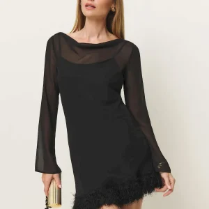 The model is wearing a size 0 and is 5’10”, 25″ waist, 34.5″ hips, 31″ bust.