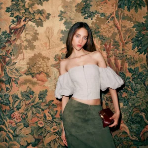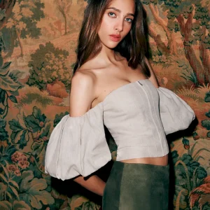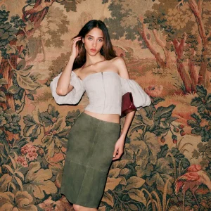The model is wearing a size 2 and is 5’10”, 23″ waist, 34″ hips, 31″ bust.