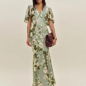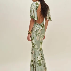 The model is wearing a size 0 and is 5’10”, 23″ waist, 34″ hips, 32″ bust.