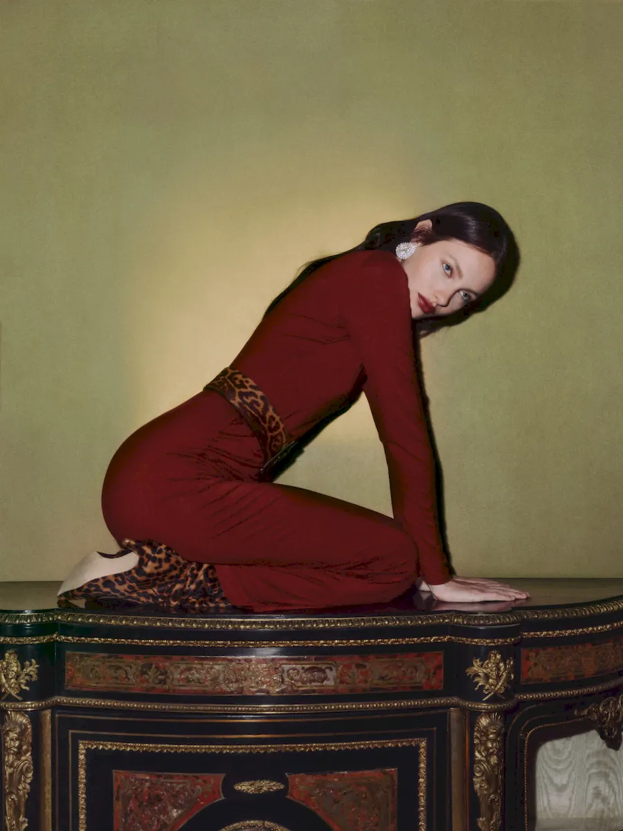 The model is wearing a size S and is 5’11”, 26″ waist, 38″ hips, 35″ bust.