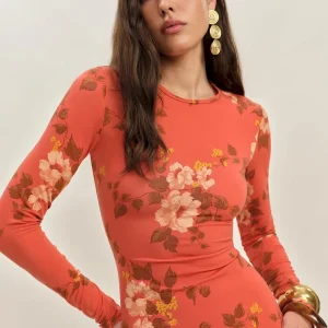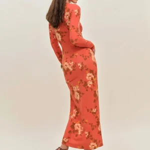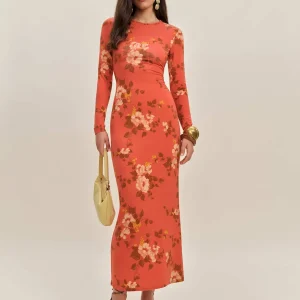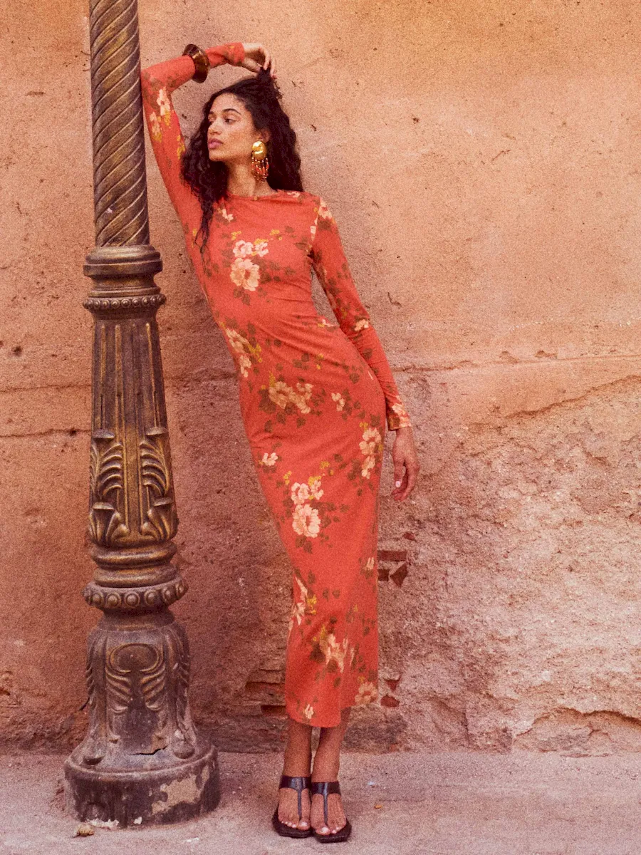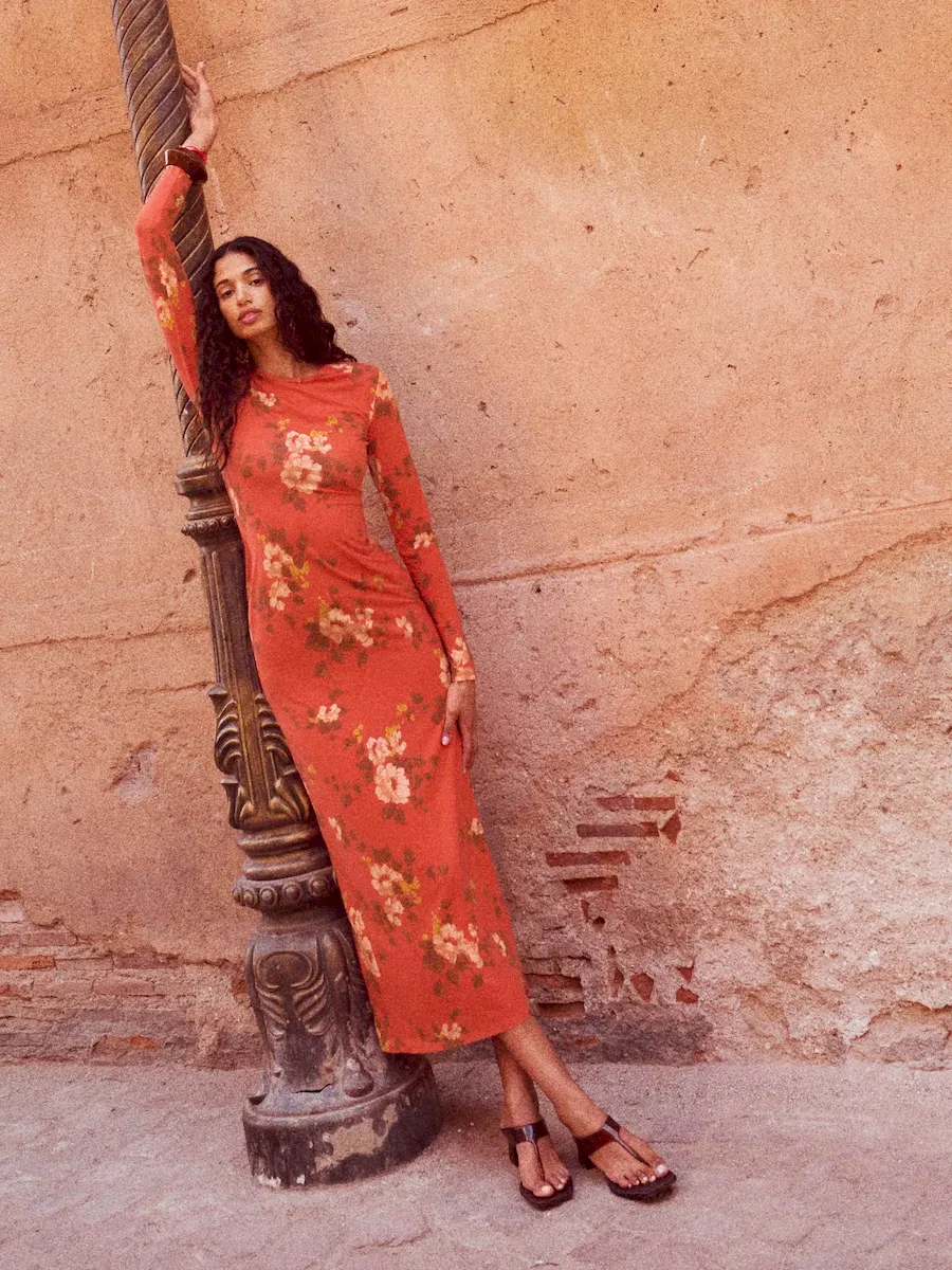 The model is wearing a size XS and is 5′ 9.5″, 24″ waist, 34.5″ hips, 34″ bust.