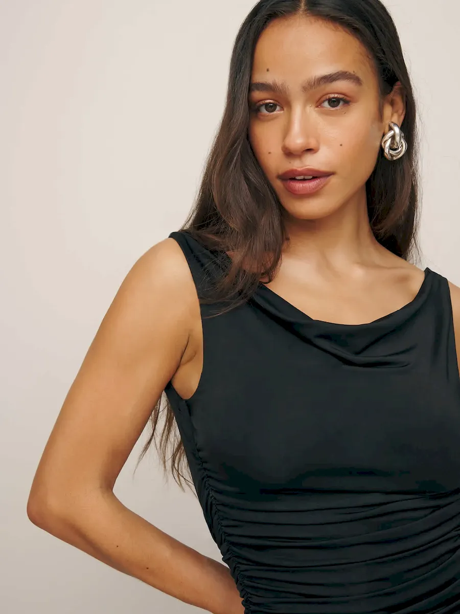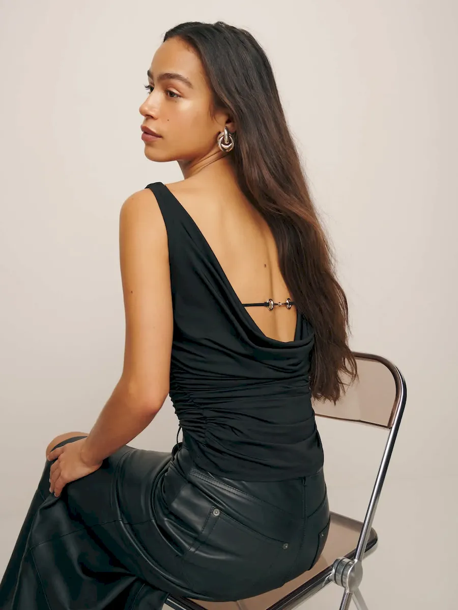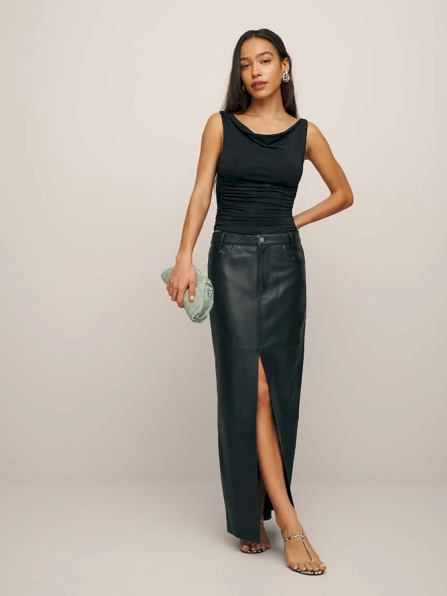 The model is wearing a size S and is 5’9″, 25″ waist, 36.5″ hips, 34″ bust.