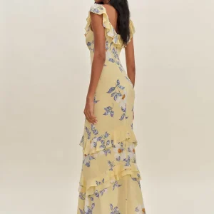 The model is wearing a size 0 and is 5’11”, 24″ waist, 35″ hips, 31″ bust.