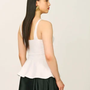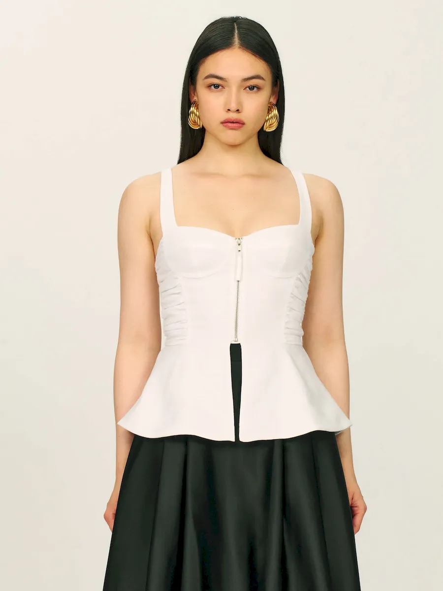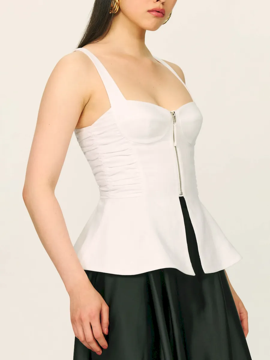 front zipper,corset style bodice,and ruching details.