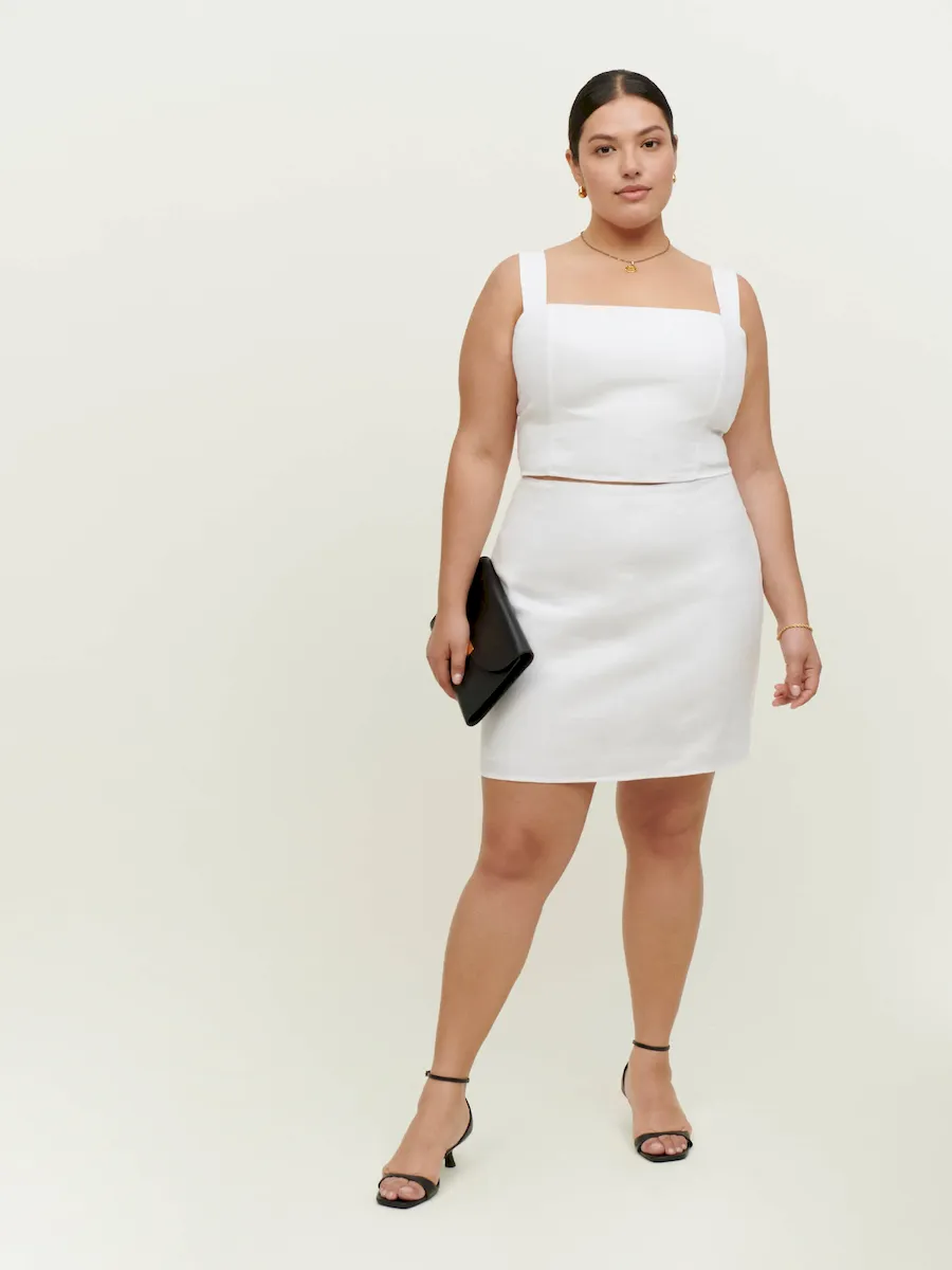 The model is wearing a size 14 and has a 35″ waist, 46″ hips.