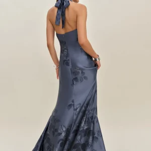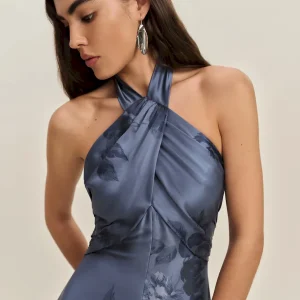 back zipper,front ruching,print may vary for each piece,and ties at neck.