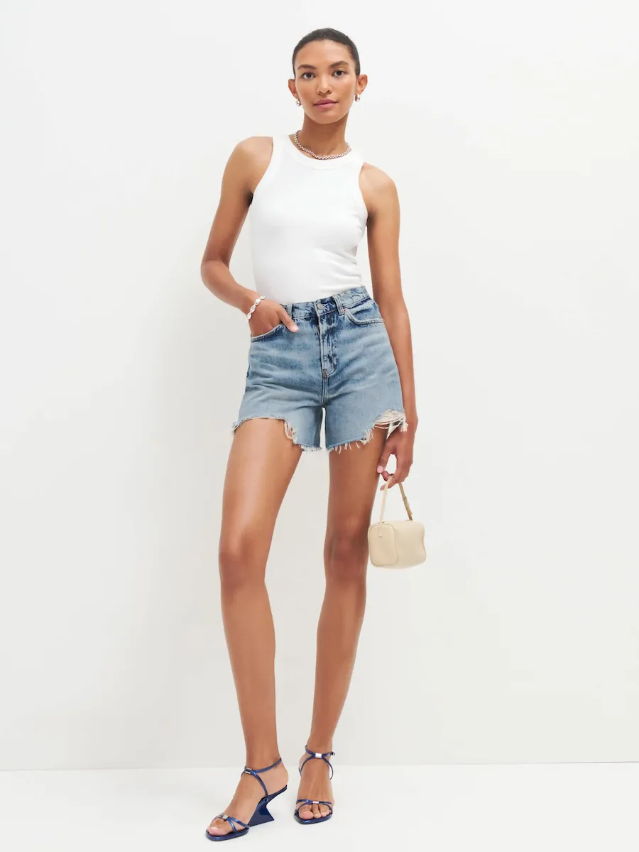 The model is wearing a size 25 and has a 25″ waist, 35″ hips.