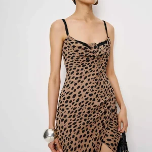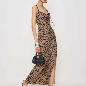 The model is wearing a size 0 and is 5’10”, 24.5″ waist, 34.5″ hips, 31″ bust.