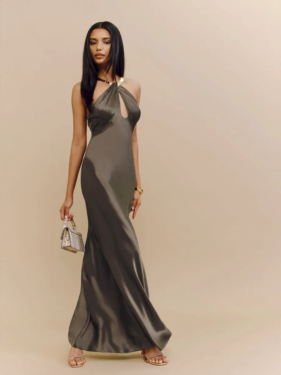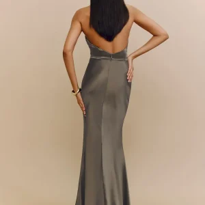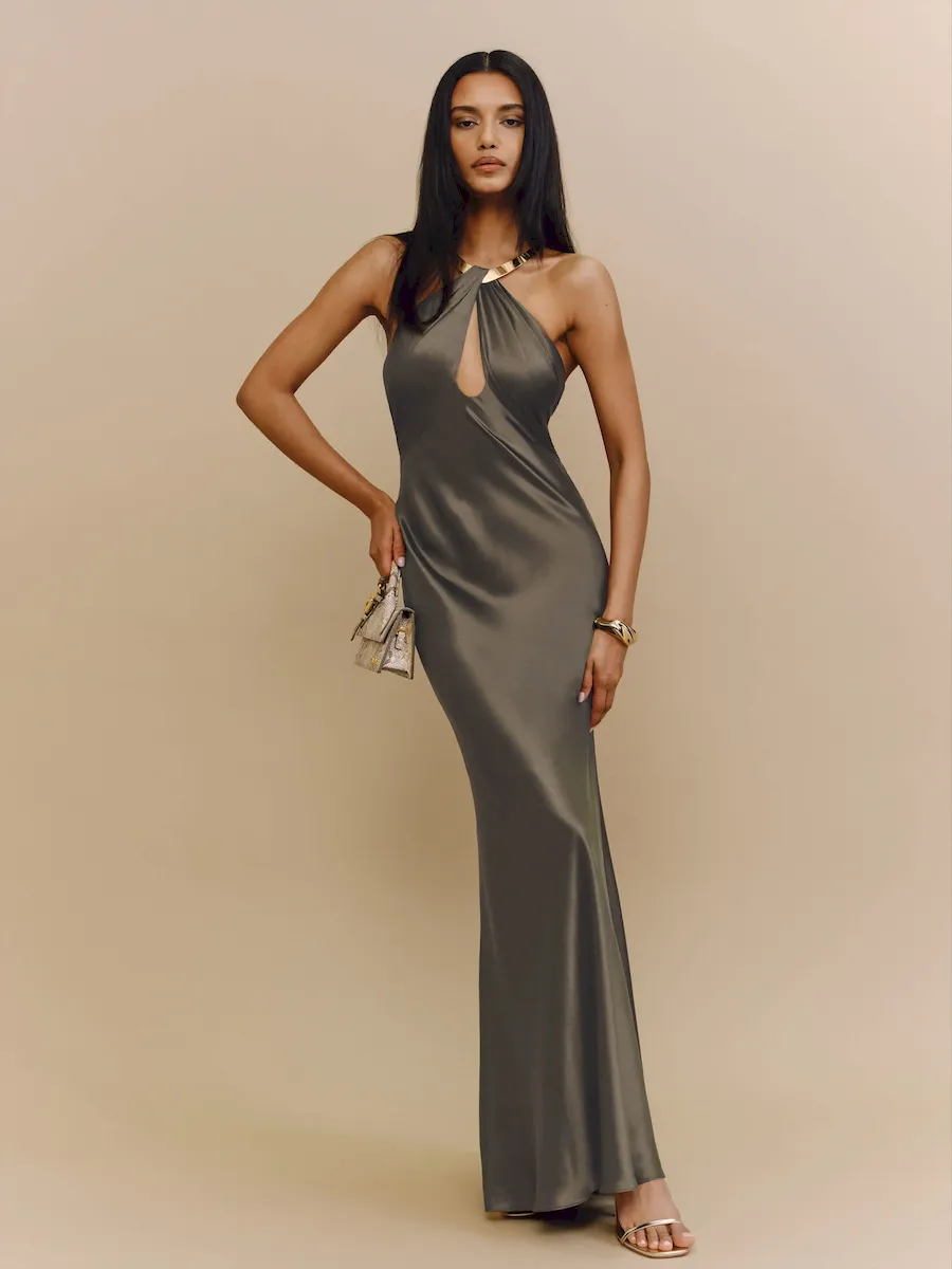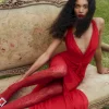 The model is wearing a size 0 and is 5’10”, 23.5″ waist, 34″ hips, 32″ bust.