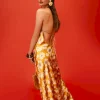 The model is wearing a size 0 and is 5’10”, 23″ waist, 34″ hips, 32″ bust.