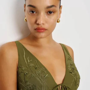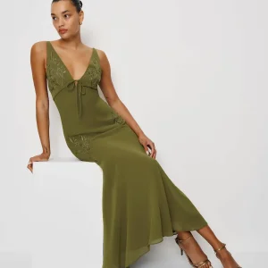 The model is wearing a size 0 and is 5’10”, 23″ waist, 34″ hips, 32″ bust.