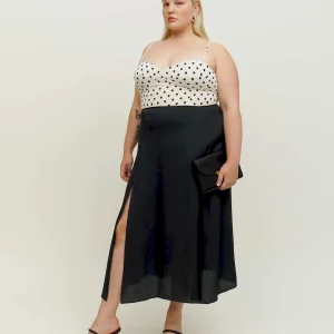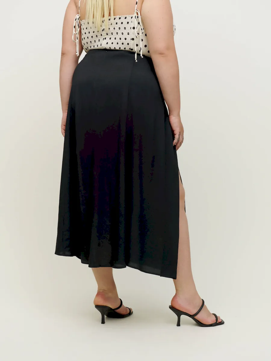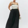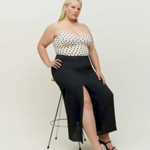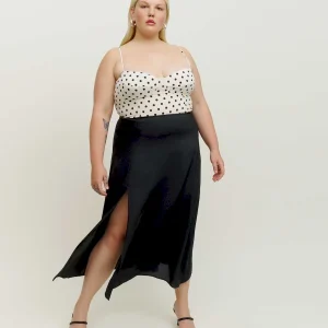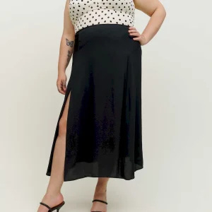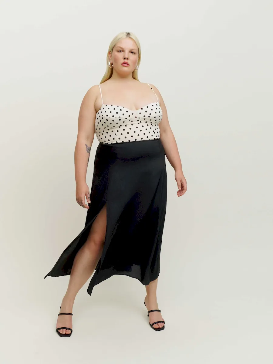 The model is wearing a size 14 and has a 36″ waist, 48″ hips.